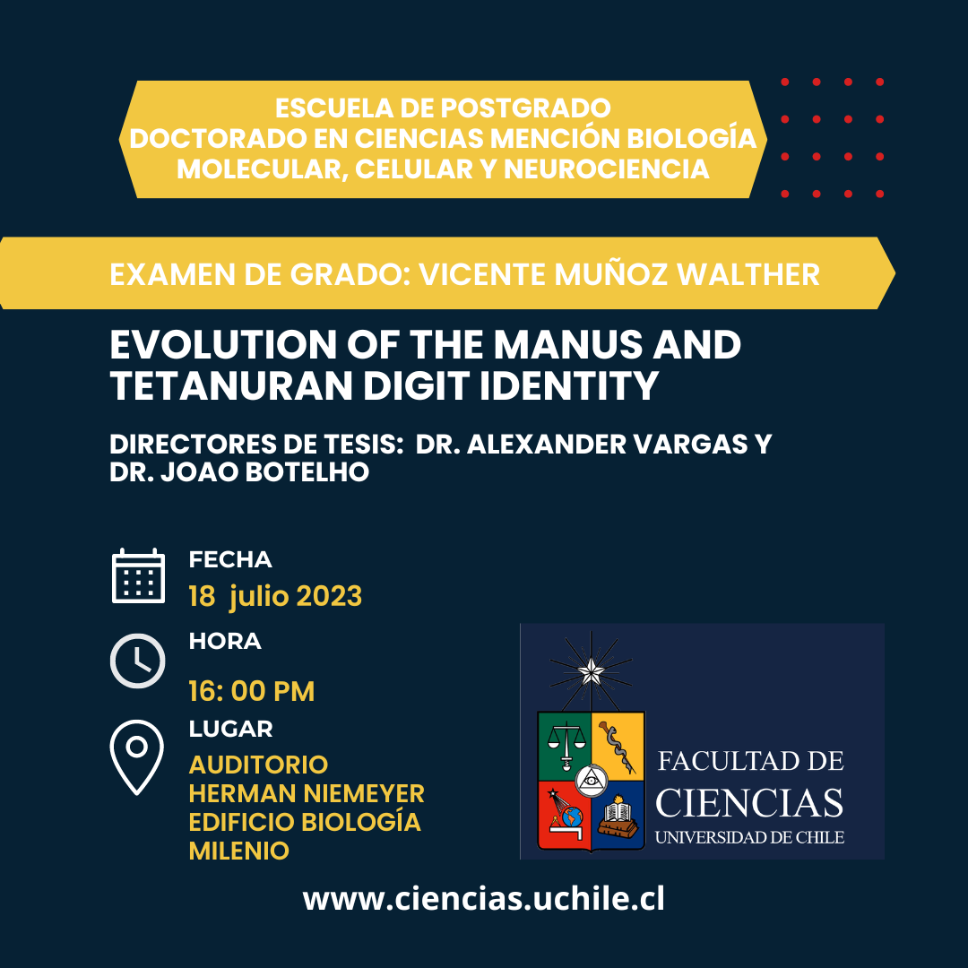 La Escuela de Postgrado invita al examen de grado del estudiante Vicente Muñoz Walther, Candidato a Doctor en Ciencias, mención en Biología Molecular, Celular y Neurociencias.