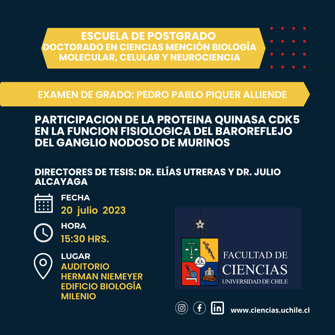 La Escuela de Postgrado invita al examen de grado del estudiante Pedro Pablo Piquer Alliende, Candidato a Doctor en Ciencias, mención en Biología Molecular, Celular y Neurociencias.