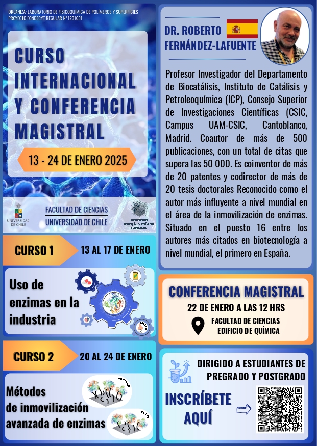 Dr. Roberto Fernández Lafuente, autor más influyente a nivel mundial en área de inmovilización de enzimas dictará cursos para estudiantes de pre y postgrado e impartirá charla magistral en la Facultad de Ciencias de la Universidad de Chile