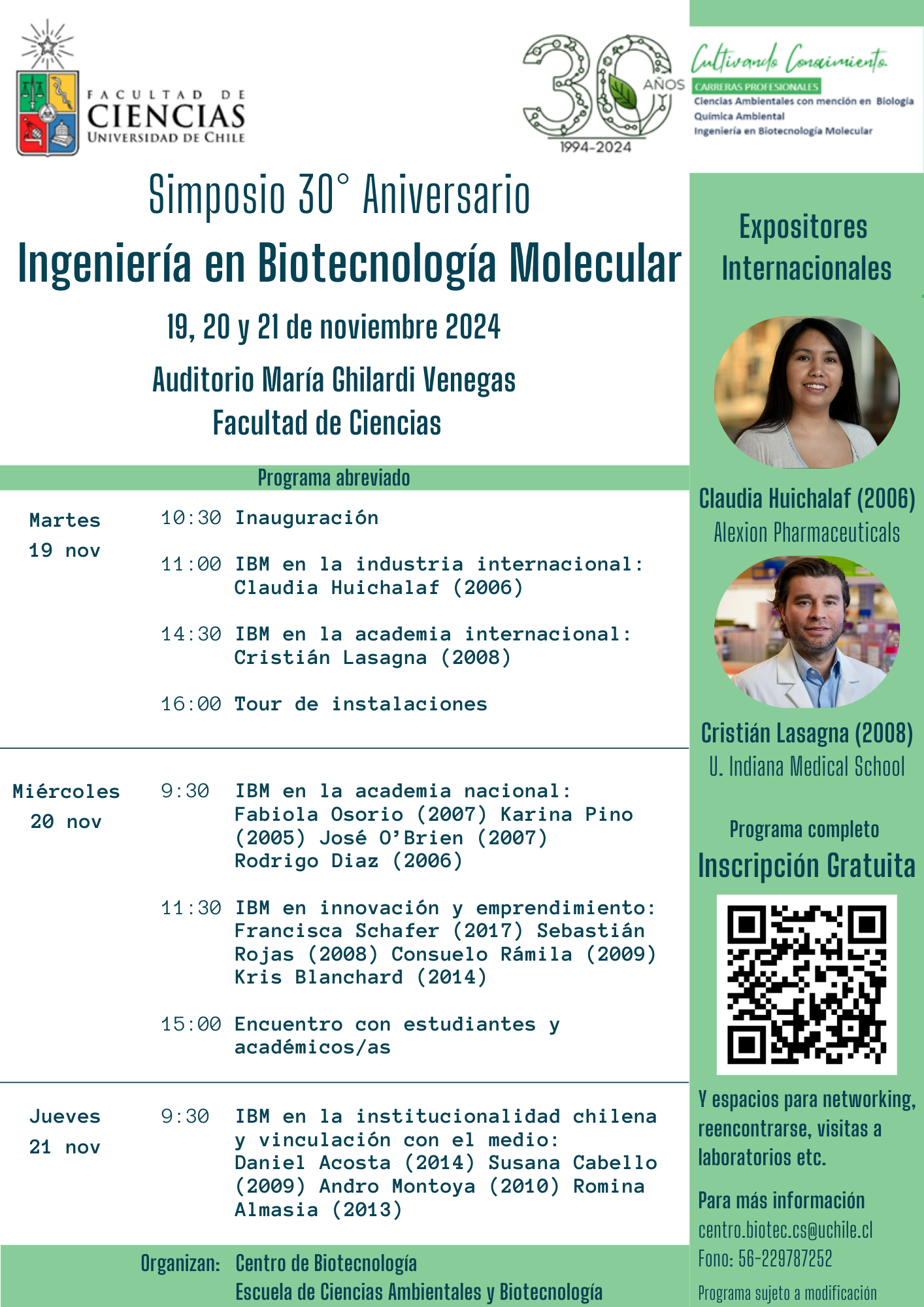 La Facultad de Ciencias de la Universidad de Chile conmemorará los 30 años de creación de la carrera de Ingeniería en Biotecnología Molecular a través del Simposio de aniversario se realizará del 19 al 21 de noviembre y contará con actividades diseñadas para estrechar lazos entre estudiantes, académicos y egresados, compartir experiencias y visiones sobre el futuro de nuestra carrera.