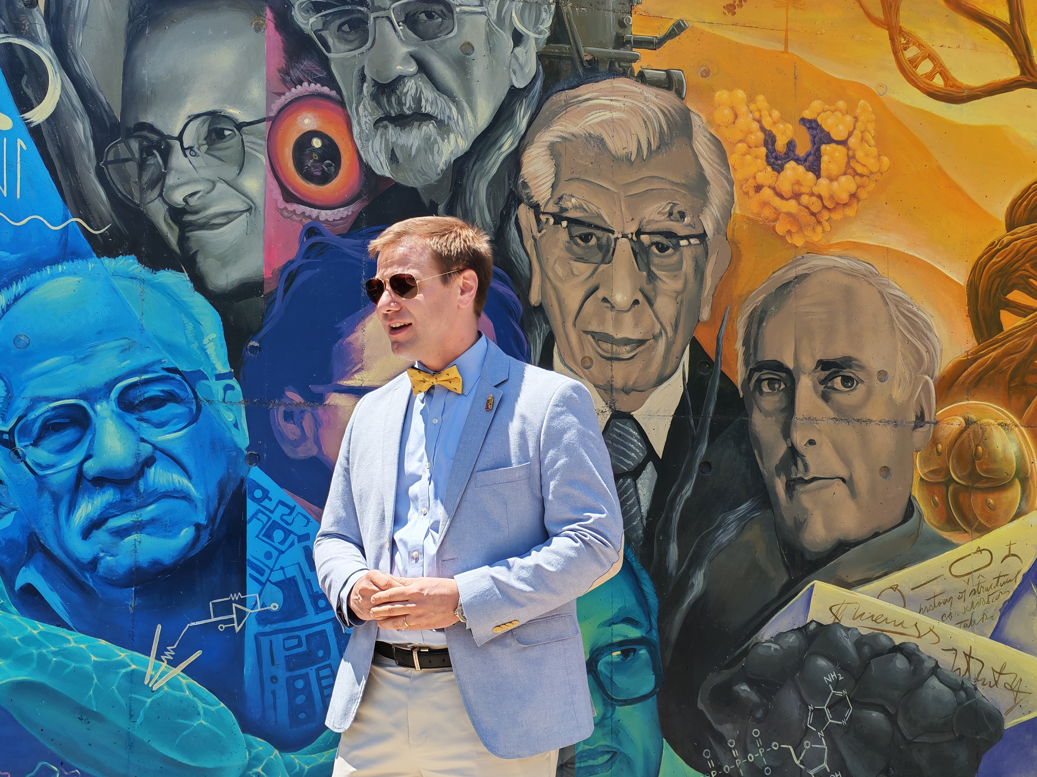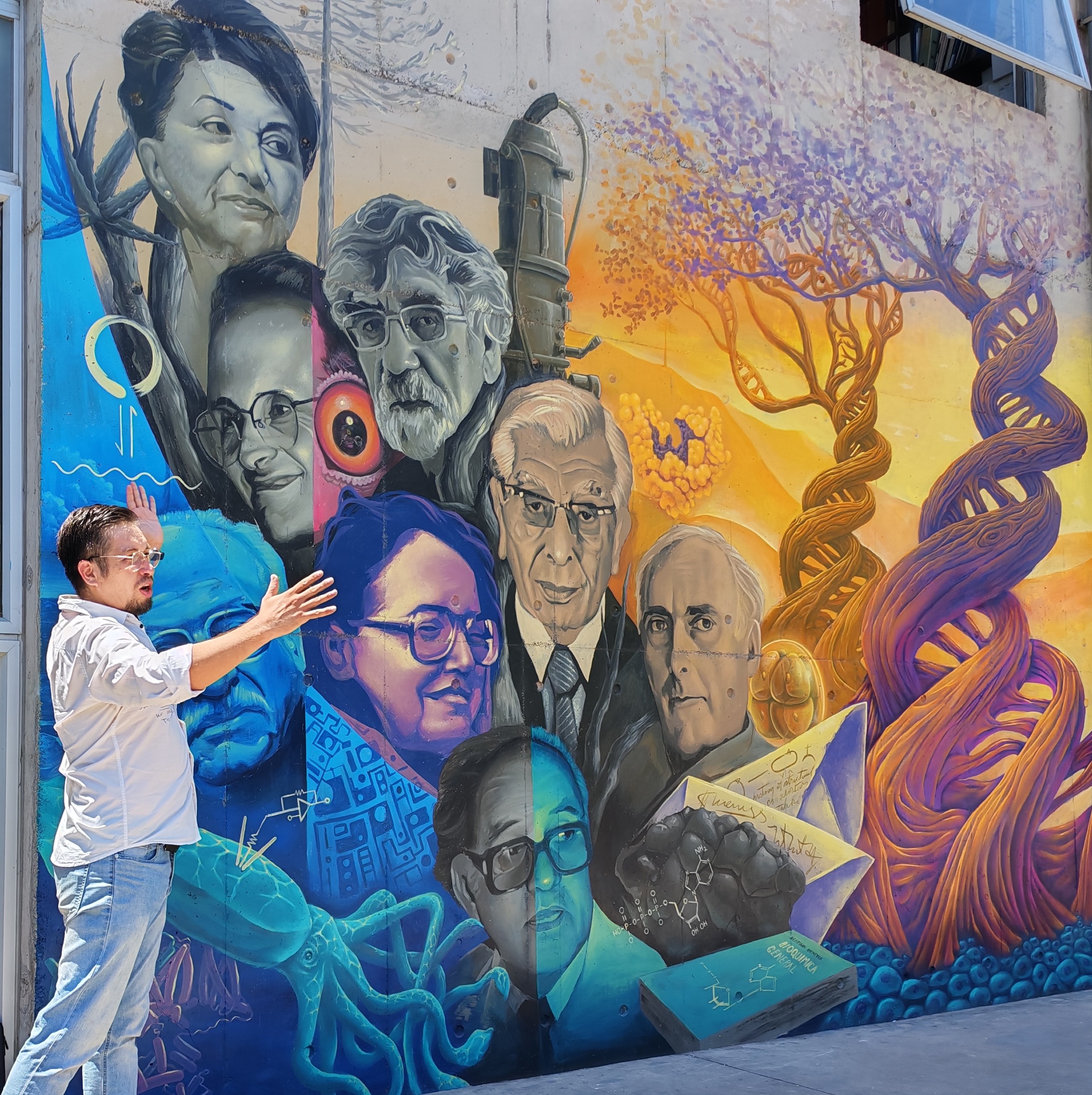 Por su parte, Andro Pantru, uno de los autores del mural, compartió una reflexión personal sobre su trayectoria tanto en la ciencia como en el arte y dio unas palabras de agradecimiento por la invitación. “Fui criado por padres muy artísticos y yo era muy bueno en los estudios. Me fasciné por la biología celular, la biología molecular, los procesos de todo ese mundo desconocido y tan alucinante. Les agradezco a todos ustedes por darme esta oportunidad de lo que es la biología, de poder conocer todo esto tan especial en el universo, esta estética tan hermosa que, sin lugar a duda, nos llena de pasión y que he tratado, a través del arte, de reflejar junto con mi amigo Samir”.